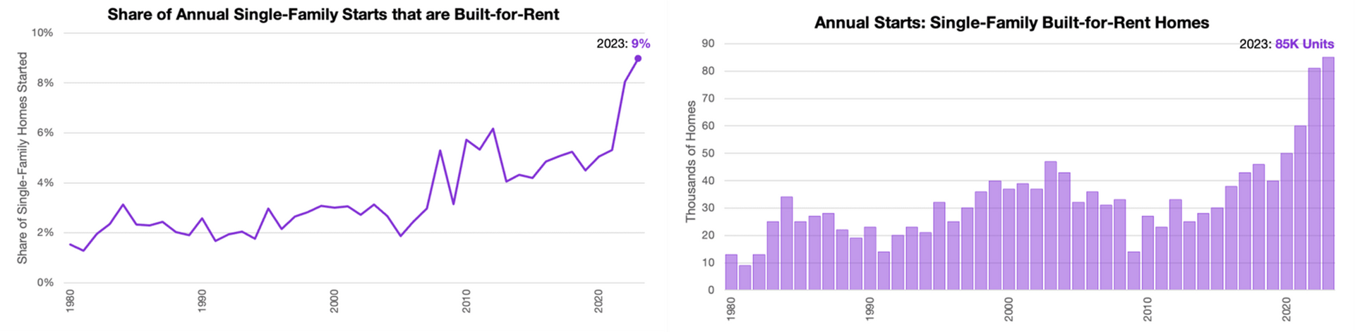 Enter the "built-for-rent" (BFR) communities—large-scale developments of single-family homes designed specifically for renters. These communities offer amenities akin to multifamily housing, appealing to those seeking a middle ground between renting and homeownership. Construction of BFR homes has seen a remarkable increase, with 2023 alone witnessing a three-fold rise in starts compared to the previous decade. This trend persists even as overall home construction has slowed down since 2021.