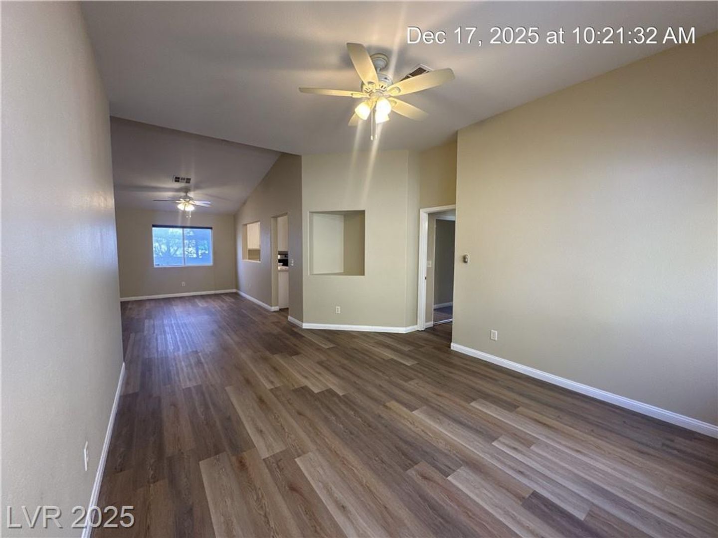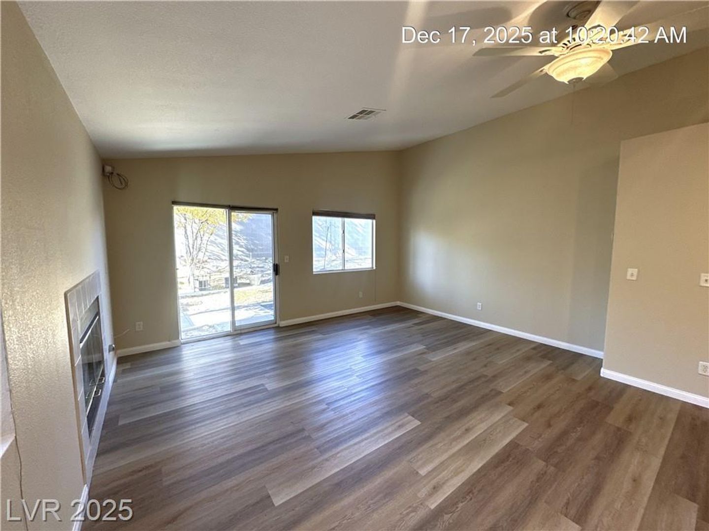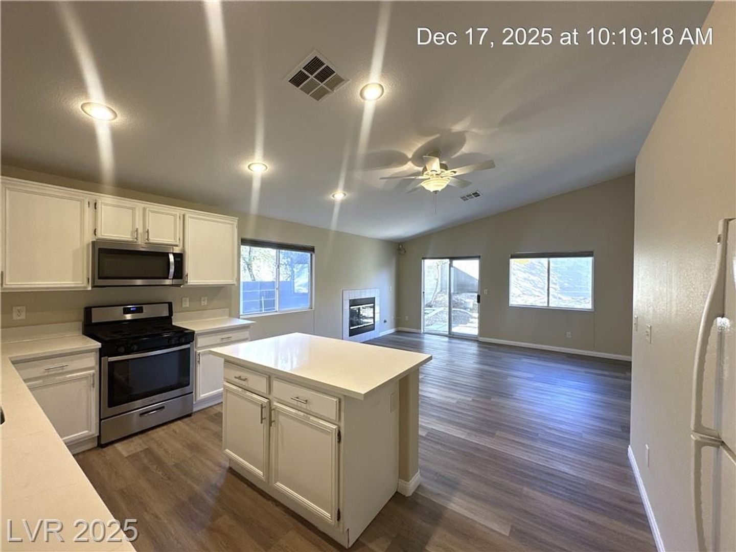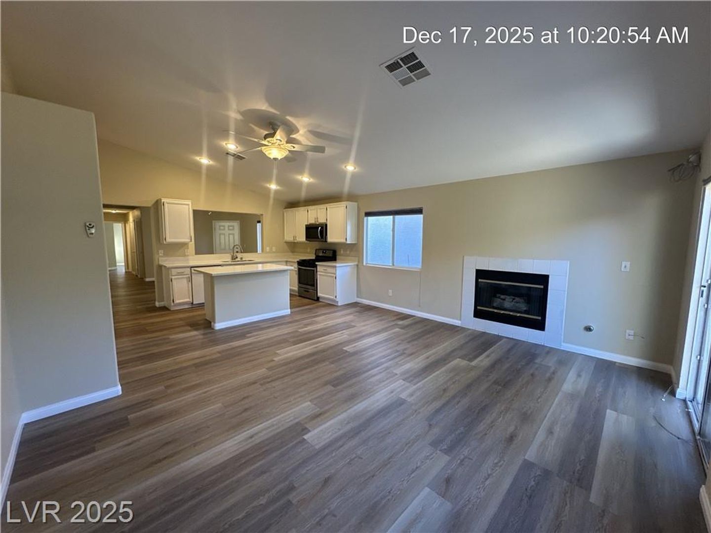 Single-story North Las Vegas home featuring a 3-car garage and a well-designed layout with vaulted ceilings that create an open, airy feel. Durable wood laminate flooring flows throughout the home with no carpet. Separate formal living and dining spaces offer flexibility for entertaining or everyday use. The kitchen is bright and functional with quartz countertops, a center island, and plenty of storage, opening directly to a spacious family room highlighted by a warm, inviting fireplace. The primary suite is tucked away for added privacy and includes dual sinks plus a separate tub and shower. Secondary bedrooms offer comfortable space, and ceiling fans with lights are installed throughout. The backyard is fully landscaped and designed for low maintenance, making it easy to enjoy outdoor living.