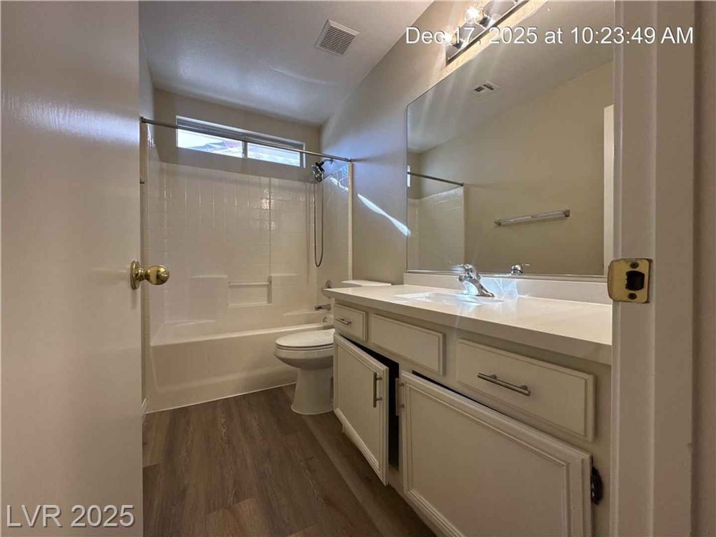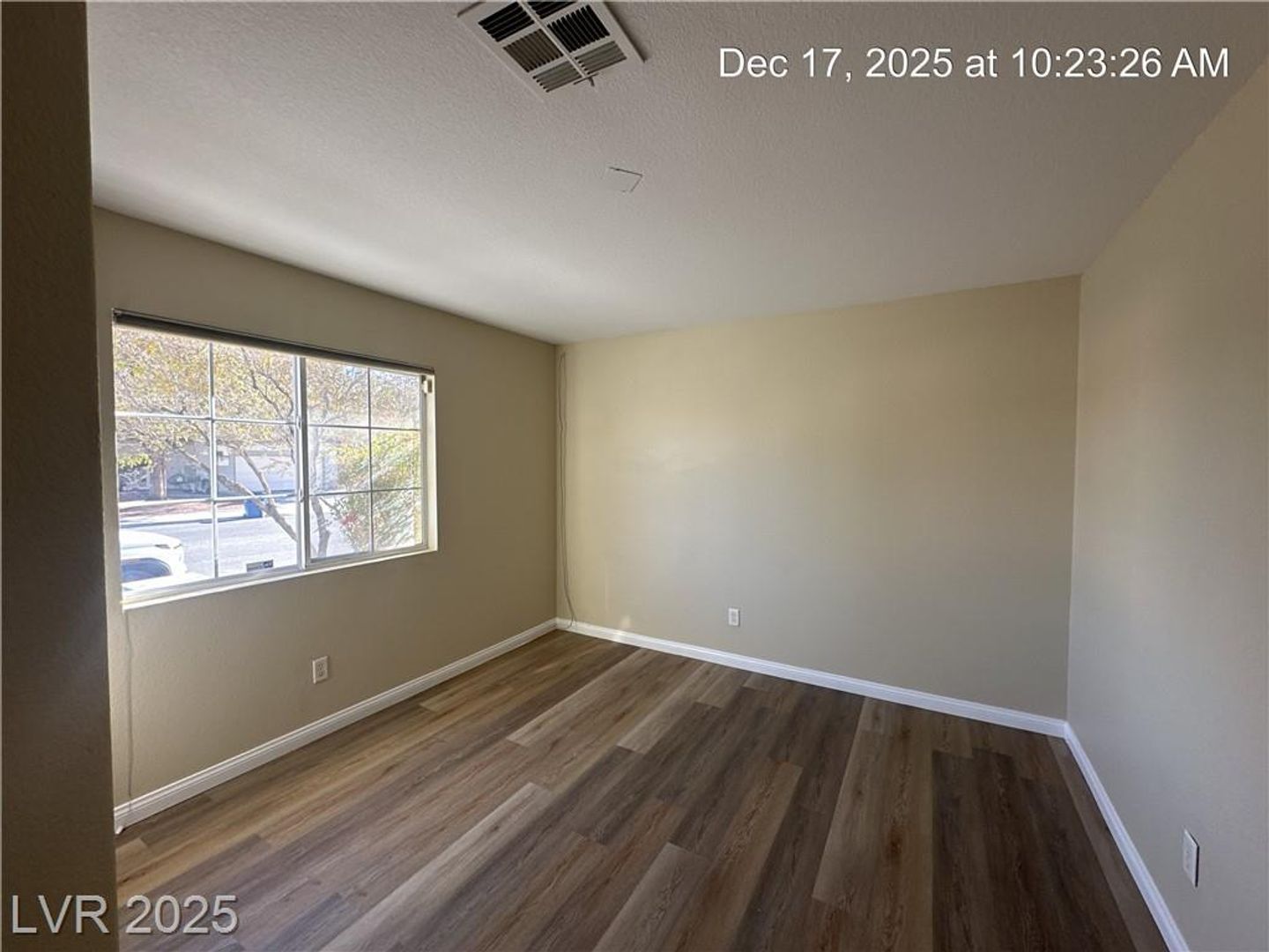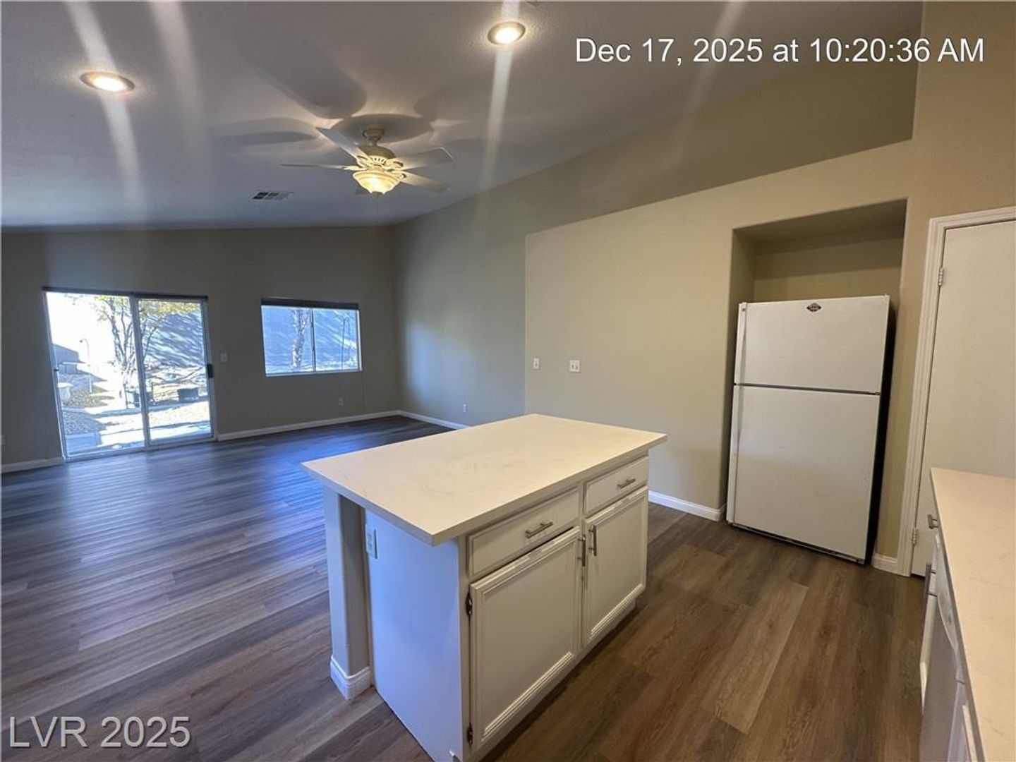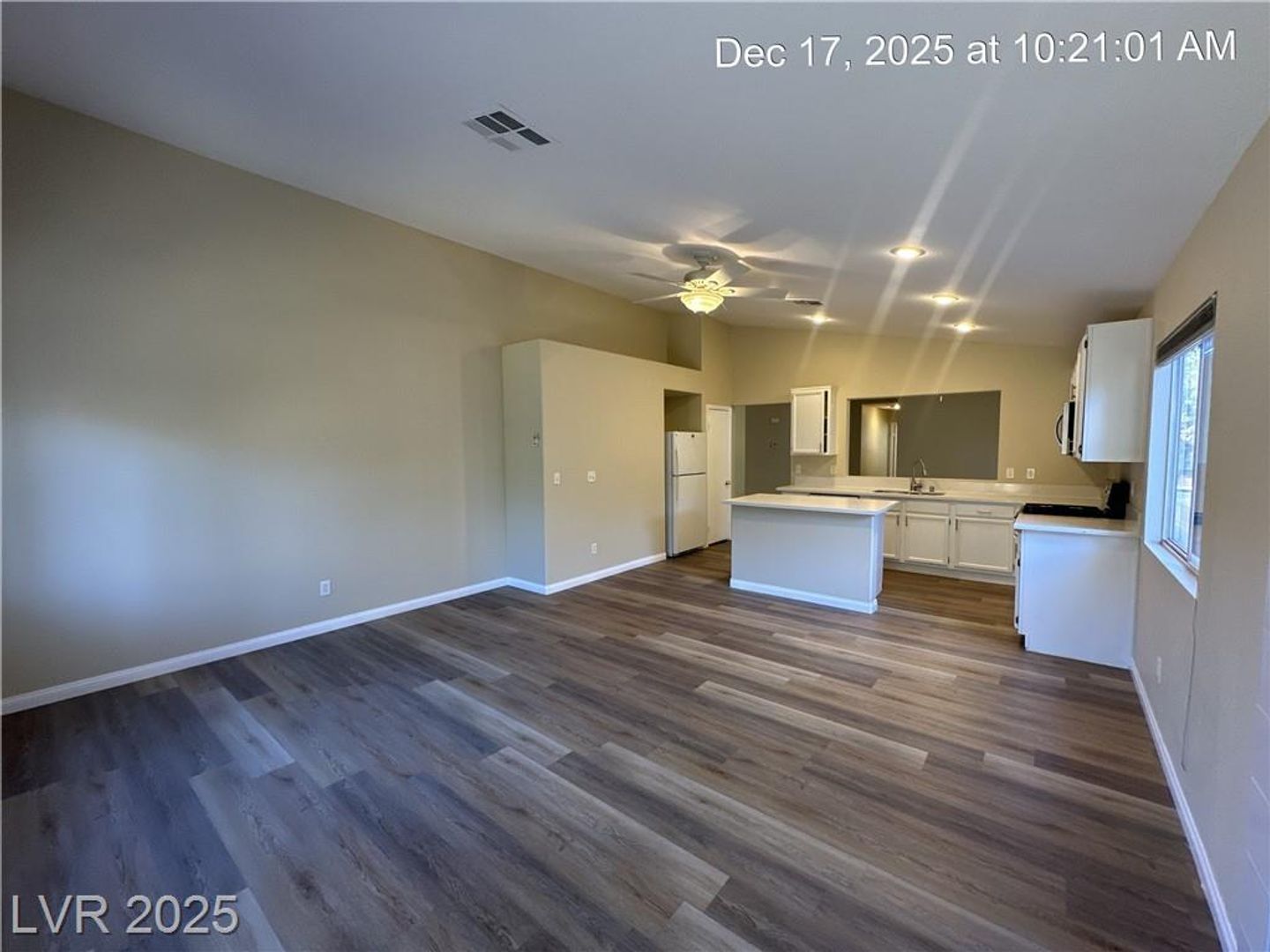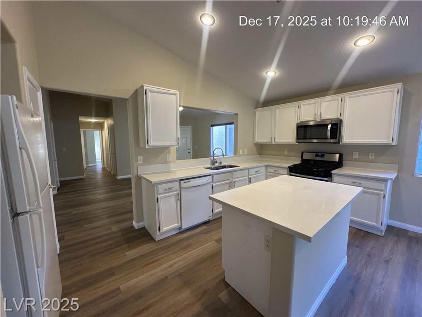 Single-story North Las Vegas home featuring a 3-car garage and a well-designed layout with vaulted ceilings that create an open, airy feel. Durable wood laminate flooring flows throughout the home with no carpet. Separate formal living and dining spaces offer flexibility for entertaining or everyday use. The kitchen is bright and functional with quartz countertops, a center island, and plenty of storage, opening directly to a spacious family room highlighted by a warm, inviting fireplace. The primary suite is tucked away for added privacy and includes dual sinks plus a separate tub and shower. Secondary bedrooms offer comfortable space, and ceiling fans with lights are installed throughout. The backyard is fully landscaped and designed for low maintenance, making it easy to enjoy outdoor living.