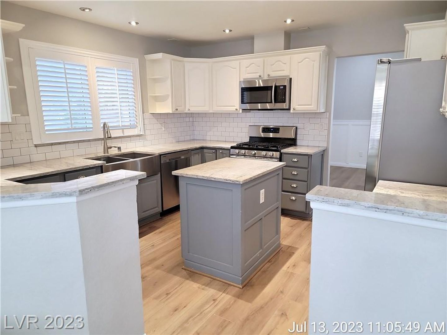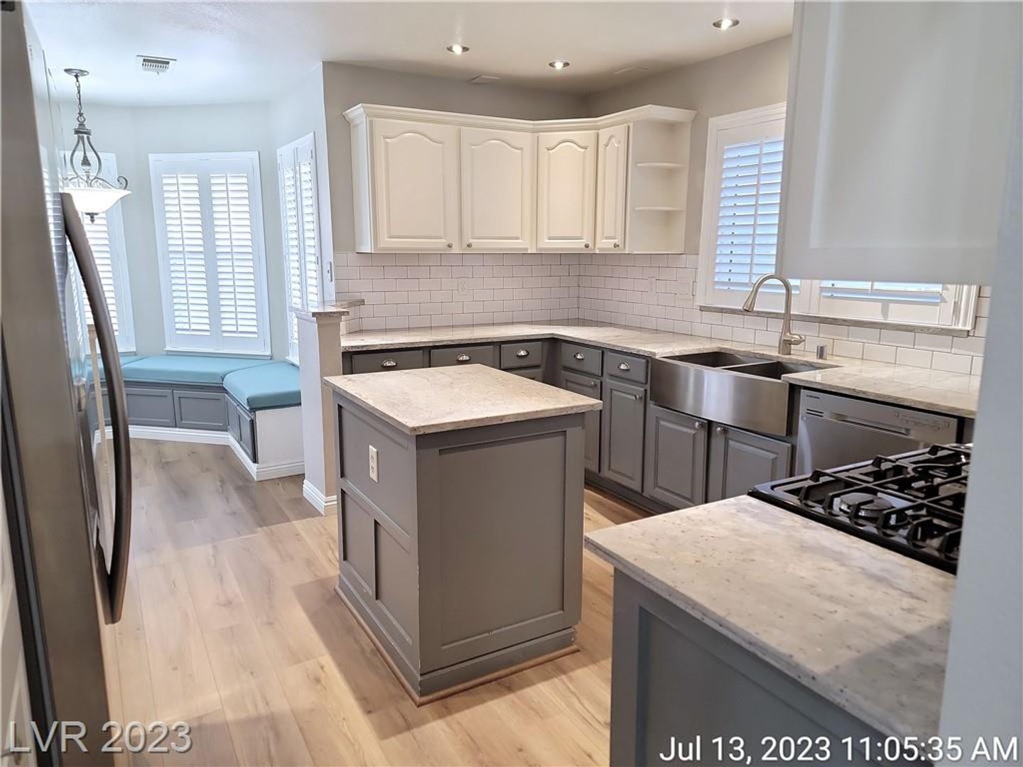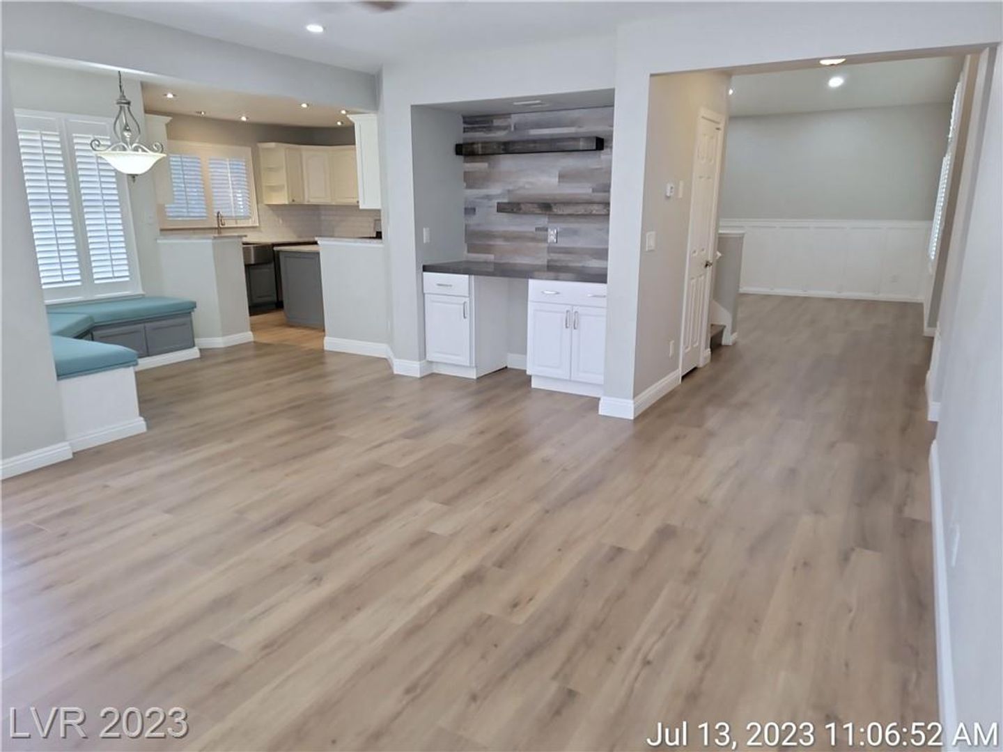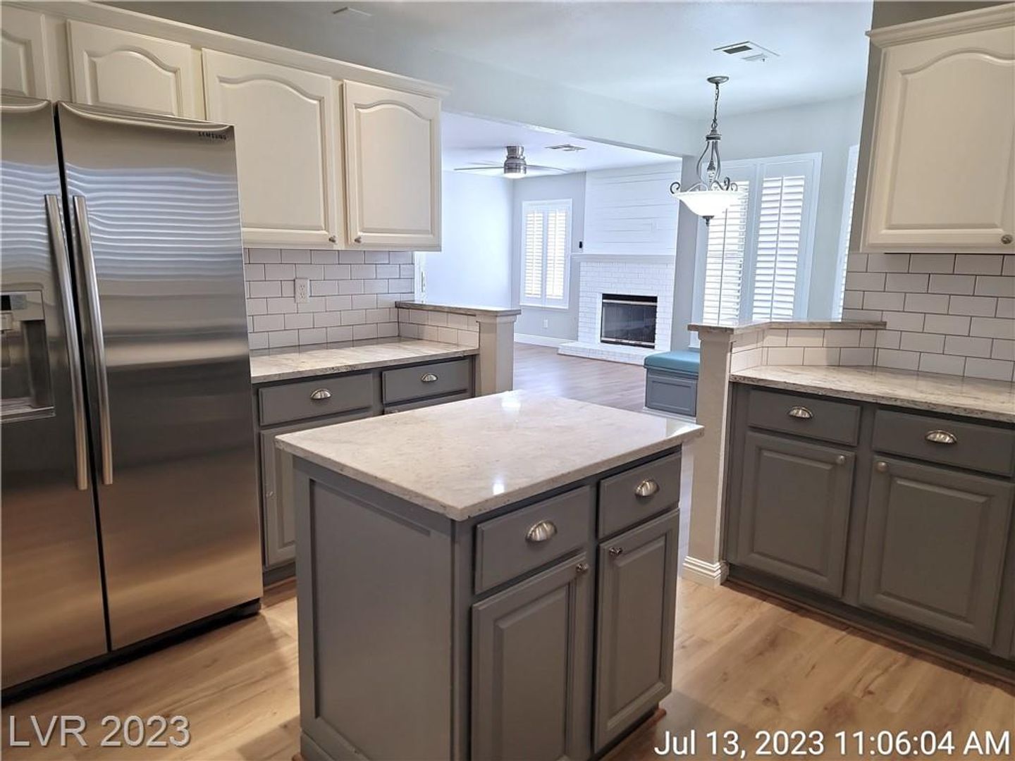 This stunning two-story home is perfectly situated in the heart of Green Valley. With beautiful wood laminate flooring throughout the first floor, the home offers an open and bright formal living/dining area with high ceilings. The chef's dream kitchen is tastefully upgraded with a nook, island, quartz counters, stainless appliances, and custom cabinets, seamlessly flowing into a spacious family area with a cozy fireplace and wet bar. The primary suite is impressively large, featuring a warming fireplace, custom walk-in closet, double sinks, and a separate tub and shower. Ceiling fans are present throughout the home, and the low-maintenance backyard boasts synthetic grass, creating an ideal space for relaxation.