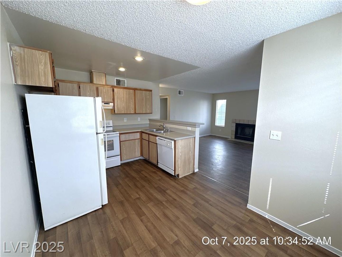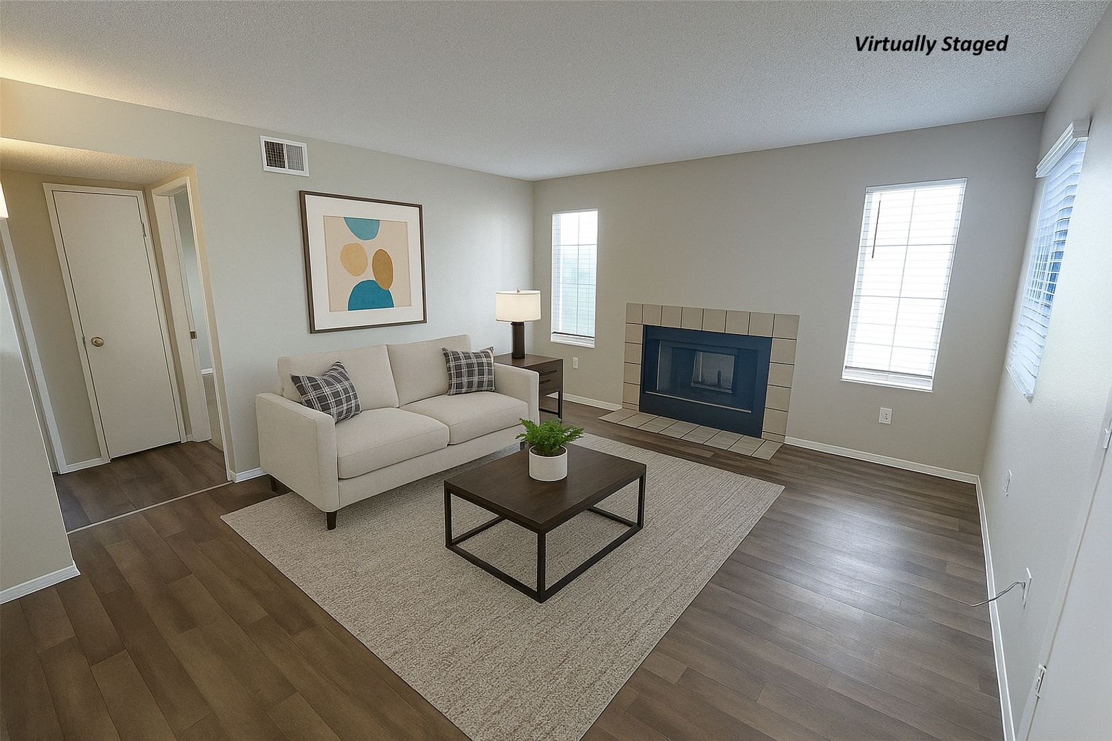 Enjoy this inviting 2-bedroom, 1-bath home offering approx. 800 sq. ft. of comfortable living. Spacious living area with fireplace and wood laminate flooring throughout—no carpet! Open kitchen with breakfast bar and dining nook. Nice-sized bedrooms and all appliances included. Community features an Olympic-size pool, playground, and lush surroundings. Small pet considered.