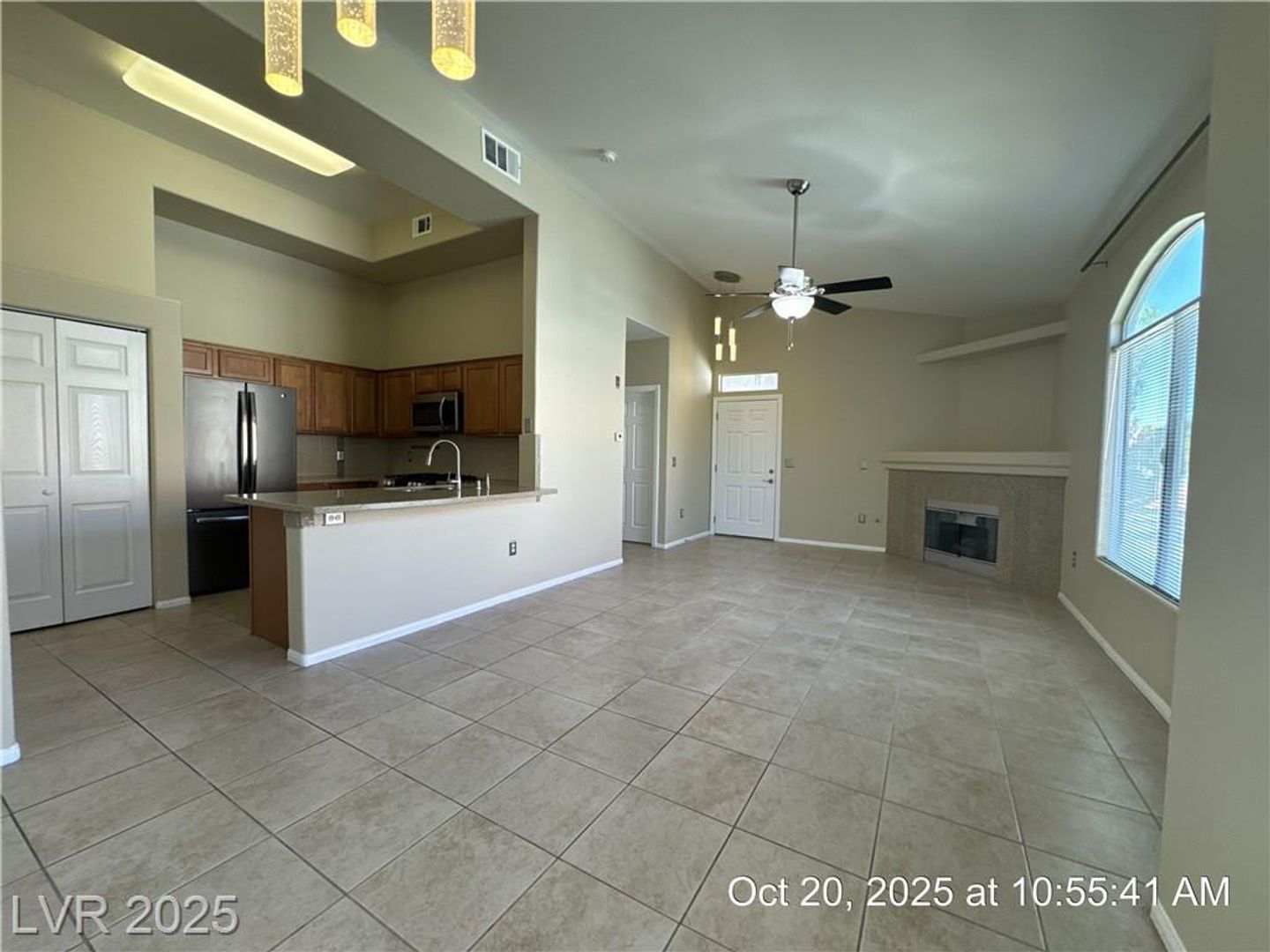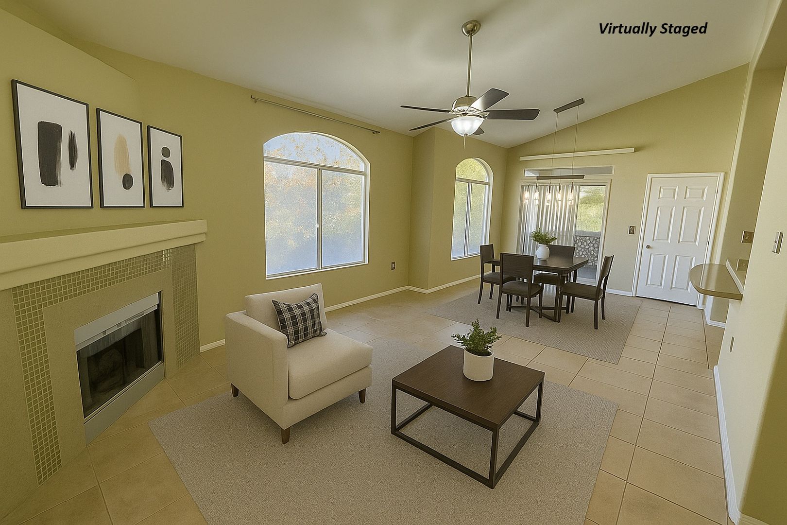 This fantastic 2-bedroom, 2-bath home offers a bright and open floor plan with a spacious living area, cozy fireplace, and dedicated dining space. The kitchen features a convenient breakfast bar and comes fully equipped with appliances. Perfect for roommates or added privacy, the layout includes two primary bedrooms on opposite sides of the unit, each with mirrored closet doors, built-in organizers, and tub/shower combos. Enjoy year-round comfort with ceiling fans throughout. Mission Ridge is a gated community offering resort-style amenities, including multiple pools and spas, a clubhouse, fitness center, and BBQ areas—everything you need for relaxation, recreation, and easy living. Detached 1 car garage.