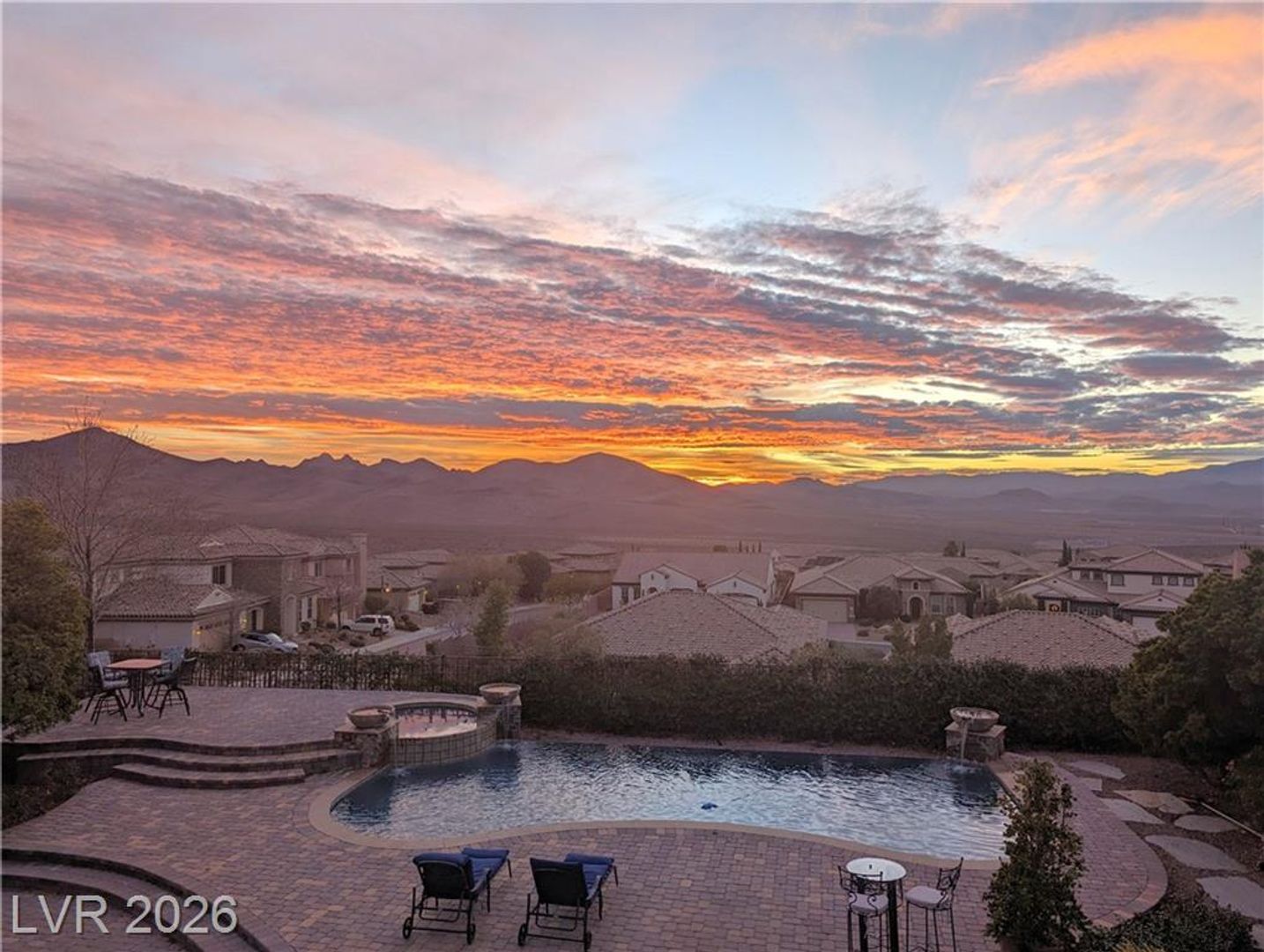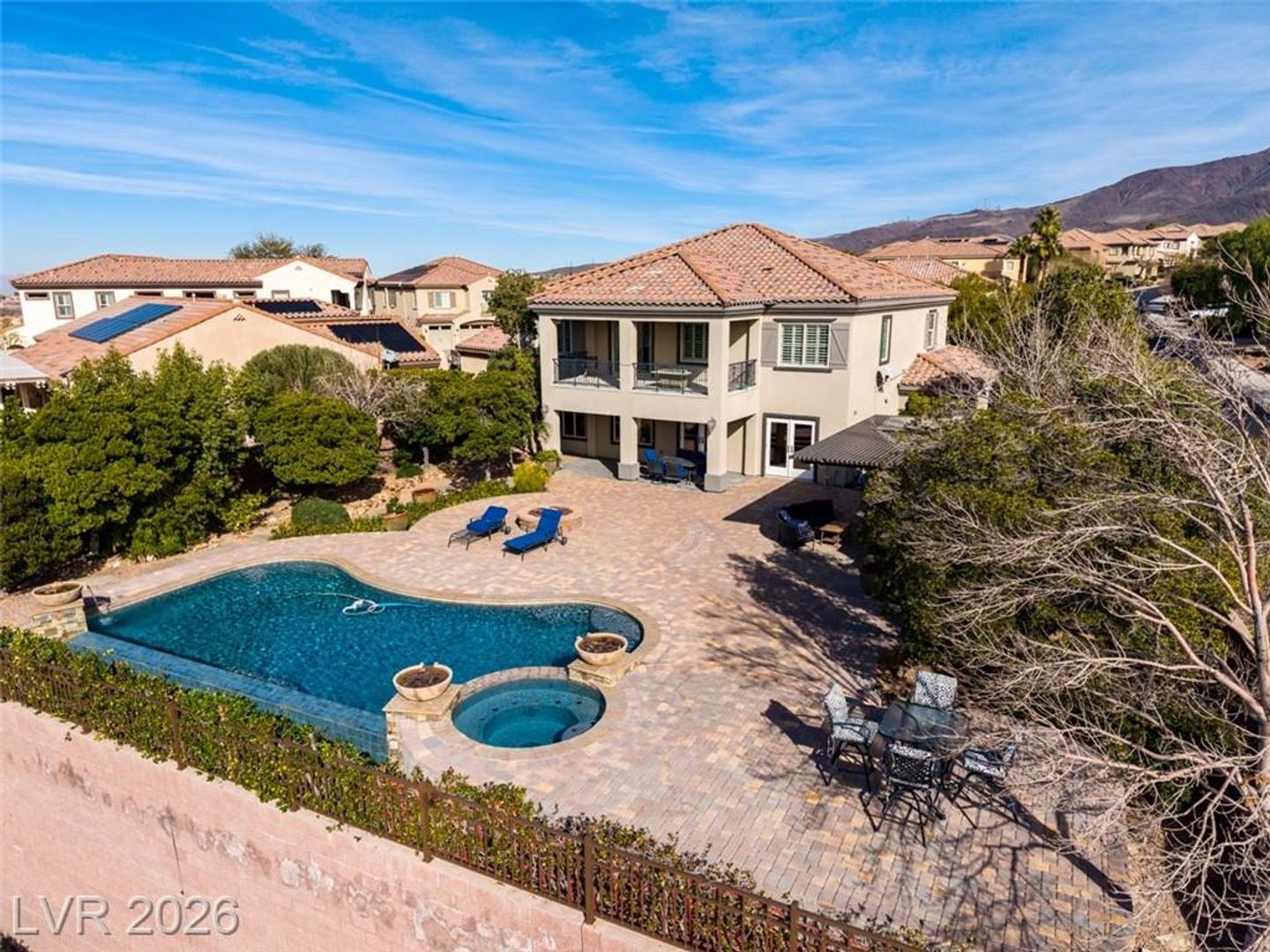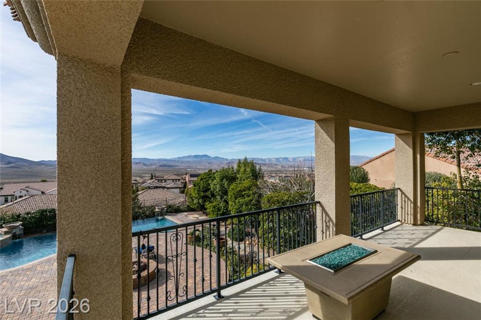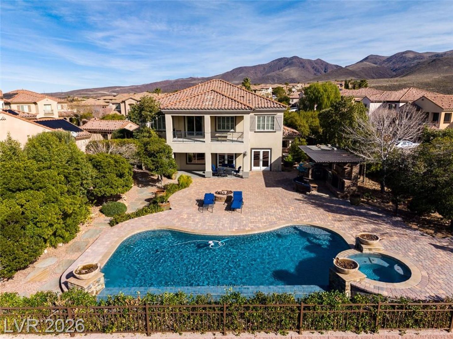Tucked inside a guard-gated community w/resort-style amenities, this stunning home feels like a private retreat. Set on a coveted corner lot, it captures beautiful sunrises & sunsets over the mountains, creating a serene backdrop from morning to night. The home offers 5 bedrooms, w/ 1 downstairs + a spacious loft w/its own balcony. The primary suite features a private balcony w/ mountain views, perfect for quiet mornings or evenings. Inside, the home is warm & inviting w/ crown moulding, plantation shutters, elegant lighting & flexible living & family rooms. The kitchen features granite countertops, dark cabinetry, stainless steel appliances & a large island w/ breakfast bar. French doors open to a large Tuscan-inspired backyard oasis w/ a pool, spa, outdoor kitchen, 2 gas firepits & a wood-burning chimney, all framed by mountain views. Community amenities include a gym, lap pool, jacuzzi, kids’ club, pickleball/tennis courts & a basketball court, delivering a true resort lifestyle.