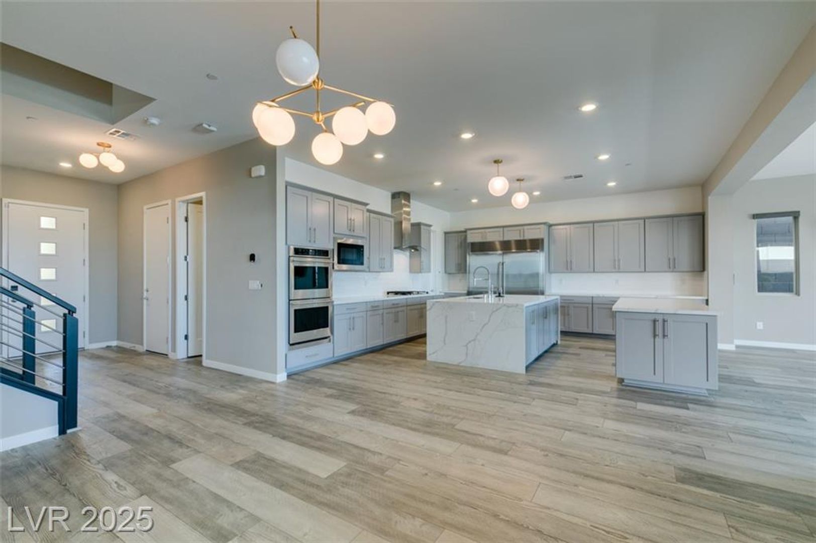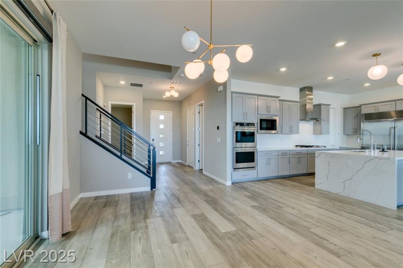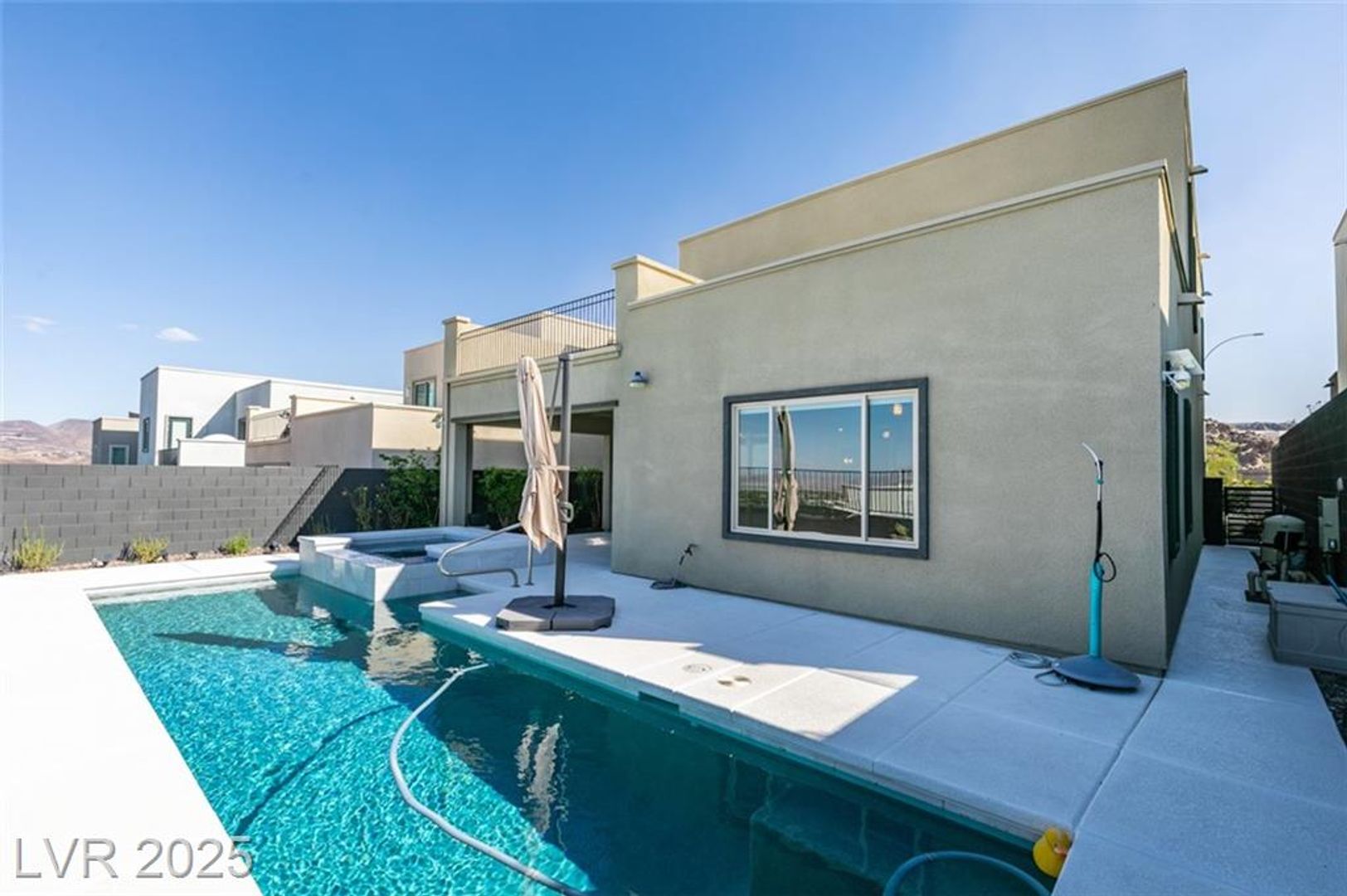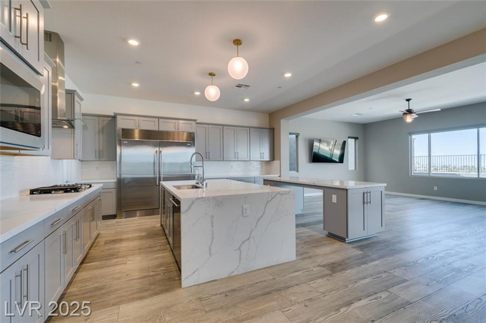 Indulge in refined contemporary living in this thoughtfully crafted home, where sophisticated design and effortless hosting come together beautifully. The open-concept first floor creates an inviting atmosphere for memorable gatherings, enhanced by sleek tile plank flooring and a chef-inspired kitchen showcasing two expansive quartz islands, a striking tile backsplash, and high-end stainless-steel appliances that make entertaining a pleasure. Four generously sized bedrooms and a spacious loft provide comfort and versatility, while the downstairs ensuite bedroom offers an ideal retreat for guests or multi-gen living. The luxurious primary suite elevates your daily escape with a private balcony framing magnificent views of the Las Vegas Strip, city skyline, and surrounding mountains. Outside, a resort-style pool and spa create the perfect backdrop for relaxing or hosting under the open sky, completing this exceptional home.