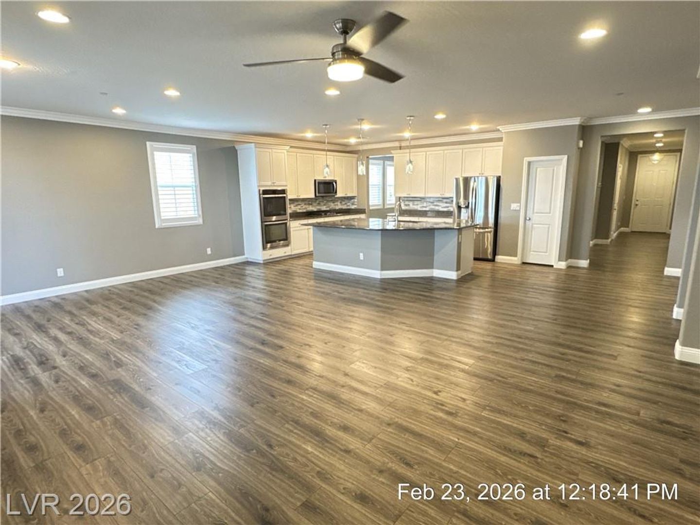 WELCOME TO THE EXCITING INSPIRADA COMMUNITY!! Single story home. Gorgeous plank flooring thru-out living areas & bedrooms, tile flooring in baths. A great room true to its name. Beautifully upgraded kitchen w/island is a chef's dream w/granite counters, abundance of storage & workspace, designer backsplash & stainless appliances. You'll never miss out on the fun while cooking- everything is focused around this "show-stopper" of a kitchen. Media room equipped w/projector & pull-down screen for the movie lover. Large primary bedroom w/walk-in, dbl sinks, separate tub/shower. Ceiling fans w/lights thru-out. No maintenance landscaped backyard has full length paver yard & covered patio, great for entertaining. NO PETS... Spectacular home. Awesome amenities w/community pools, fitness center, tennis & basketball courts, skate parks, playgrounds.